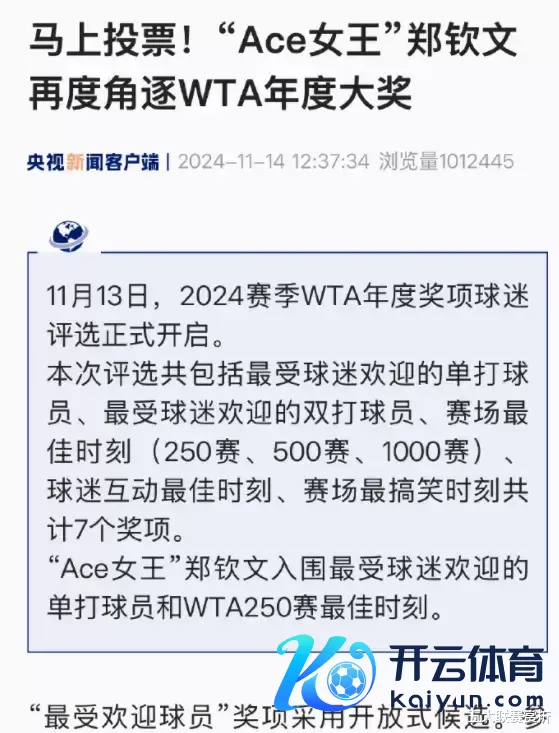 第一个捷报,郑钦文将角逐WTA年度大奖的2个奖项争夺。分歧是年度最受球迷接待的单打球员、WTA250赛最好技术。