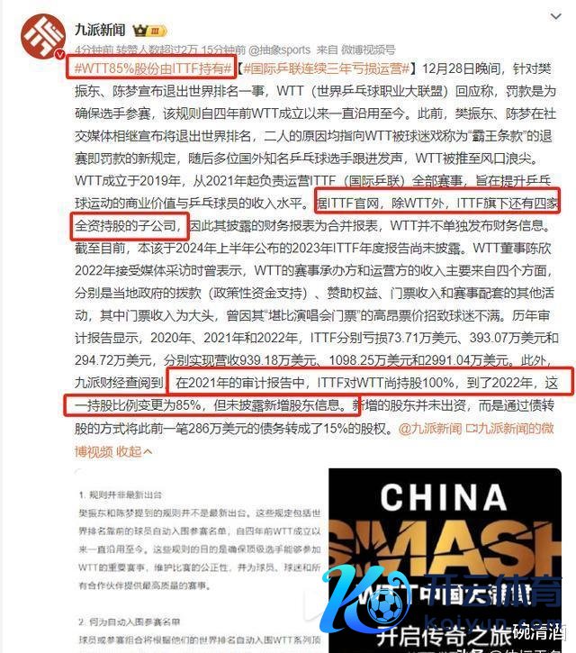 国内的《九派新闻》可把国外乒联的推动架构给扒出来啦!在2021年审计叙述里,国外乒联对WTT但是捏股100%呢。但到了2022年就变啦,只剩85%的捏股啦,另外15%被私密的新推动给拿走啦。这新推动还挺相配,没出资哦,是用债转股的要道,把286万好意思元债务形成了15%股权呢。国外乒联和WTT的那些内幕,以后折服会一个个被揭开,说不定还会掀翻更大的风波哟。