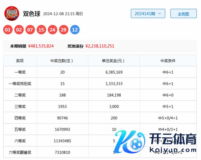 双色球第2024141期开出奖号为01、02、07、15、24、29+12。其中红球号码奇偶比为4:2体育录像/图片,三区比为3:1:2,大小比为2:4,蓝球开出偶数号码12。